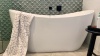 This white freestanding bath in our Kellyville main bathroom renovation project is the perfect place to relax and unwind. Positioned under the large window and in front of the fish scale feature with black matt wall mount tap-ware wall creating a gorgeous bathroom design.